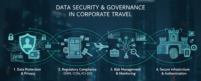 Corporate travel data is incredibly sensitive. It reveals employee locations, spending patterns, client relationships, and business priorities. One data breach or mishandled AI query could expose competitive information or violate privacy regulations. Here are the core pillars of Security and Governance which are essential to be established