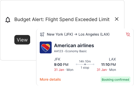 Get instant notifications when spending nears or exceeds limits, view real-time utilization, and make policy enforcement effortless across flights, hotels, and ground bookings.