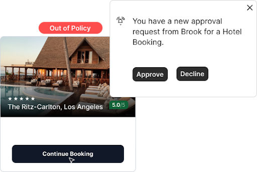 The traveler receives an instant notification with policy-compliant alternatives. Approvers and finance teams get corresponding alerts, which they can approve or reject directly.