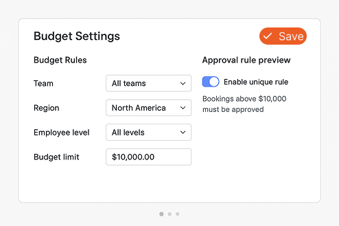 You can define budgets by department, project, employee level, region, or travel category (flights, hotels, car rentals, meals). Each rule connects automatically to the company’s policy.