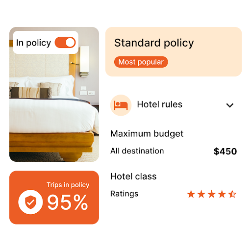 Set up your corporate travel policy in just a few clicks. Define rules by team, role, or travel class—and roll them out instantly, keeping your organization compliant and agile.