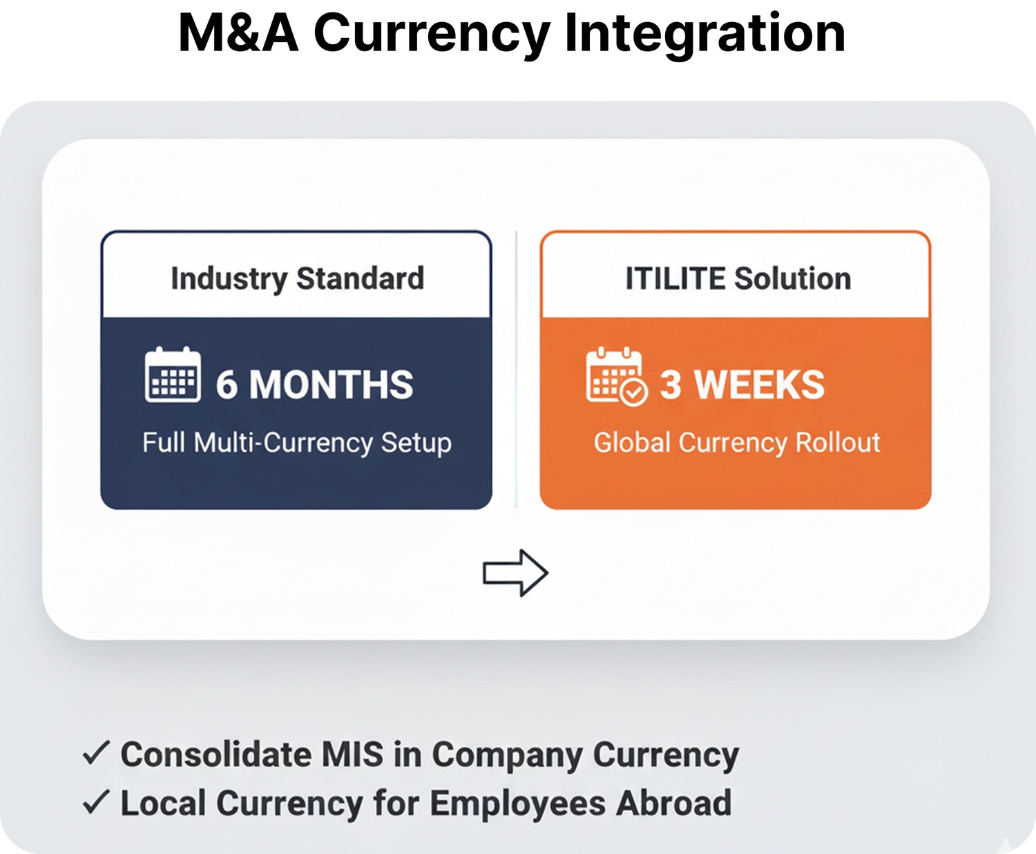 Multi-currency sets up CAD, EUR, GBP in three weeks. MIS consolidates in company currency while showing local currency to employees abroad.