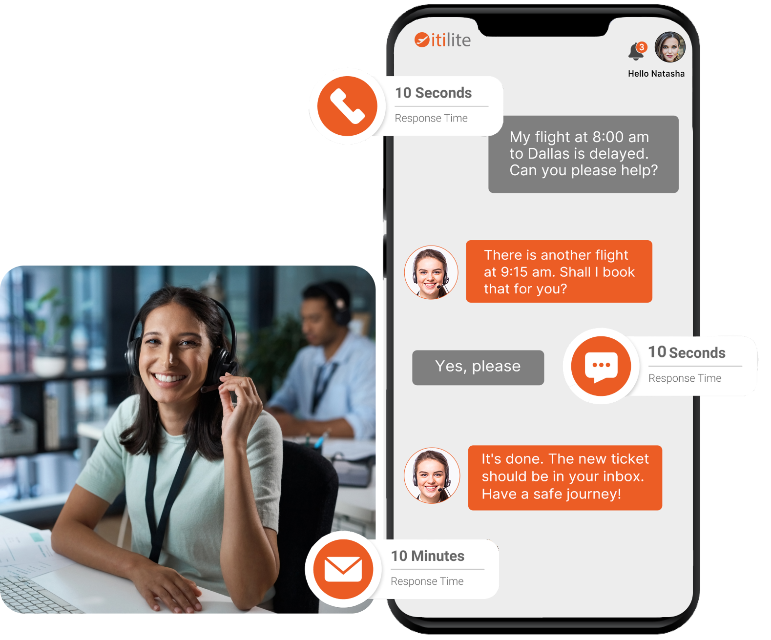 Itilite offers live human agents reachable in ~10 seconds by phone or ~30 seconds by chat, with full access to booking history and decision-making authority, 24/7/365, helping resolve travel issues within 60 minutes under its service model.