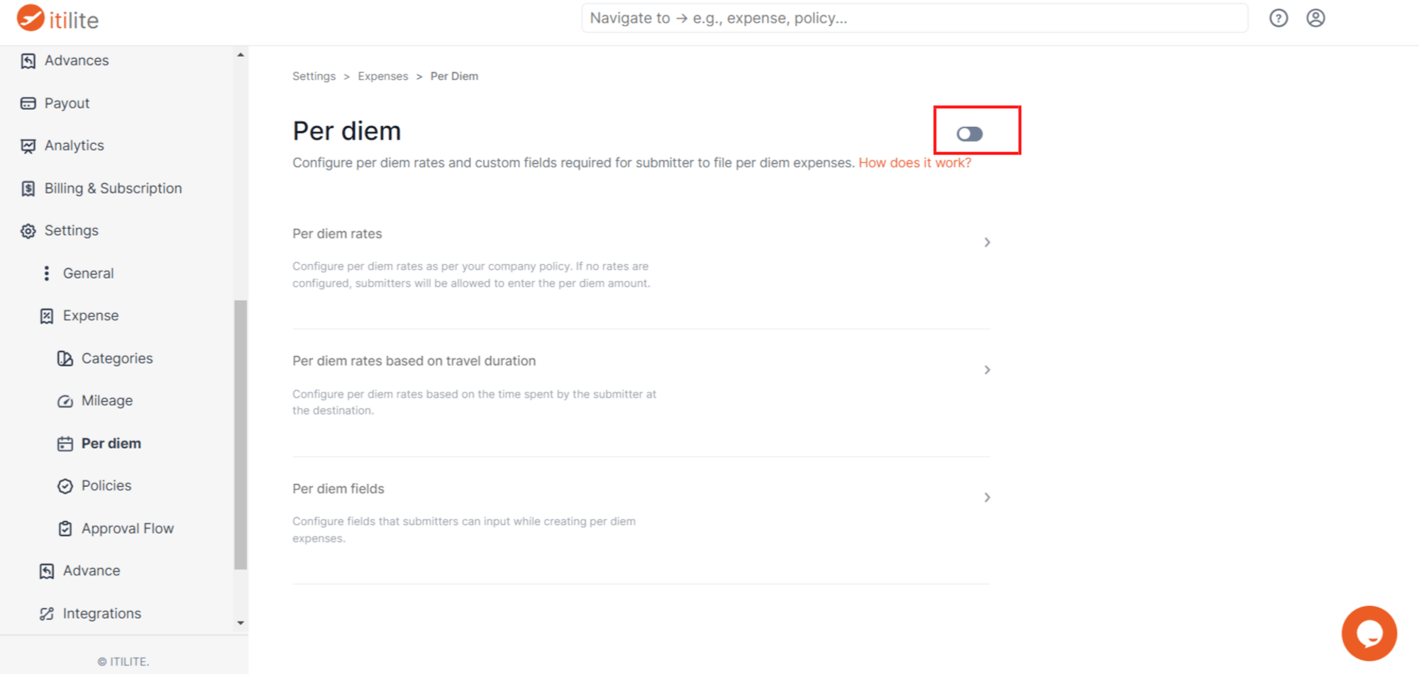Step 2) By default, per diem is disabled for all new customers. You can enable it by clicking on the toggle in the top right corner.